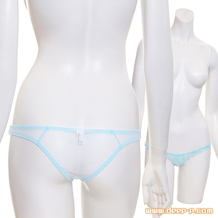 後ろにレース飾りで前はスケスケ 途中からの線がHなTバックパンティー 花柄レースシースルー 水色 ラポーム